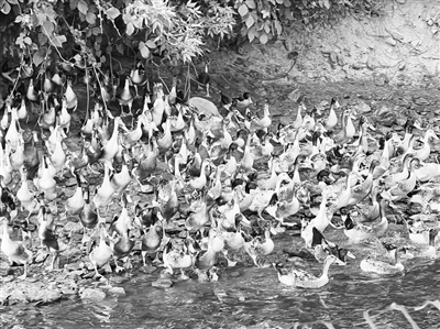 在莲花县高洲乡黄天村养殖基地,莲花麻鸭正在水中嬉戏。莲花麻鸭是赣菜“十大名菜”之一“莲花血鸭”的主要原料。近年来,莲花县把本地富硒土壤资源与传统特色佳肴有机结合,着力打造富硒血鸭产业,带动更多农民增收致富。陈丽红摄