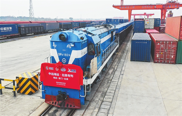 作为“十四五”首批国家物流枢纽,南昌向塘国际陆港积极开行中欧(亚)国际直达班列和铁海联运外贸班列,满载“江西制造”,驶向30多个国家和地区,为江西加速融入共建“一带一路”提供了重要支撑。本报全媒体记者 史港泽摄