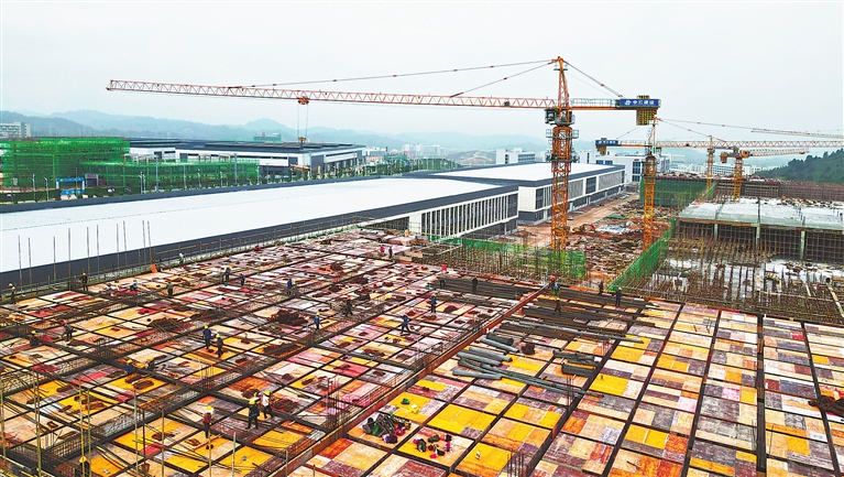 10月3日,位于龙南经开区的赣州5G智能总部标准厂房及基础设施建设项目现场,工人们正在加紧作业。国庆假期,该市有103个项目不停工,完成投资约1.4亿元。特约通讯员 叶 波摄