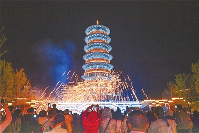 10月9日晚,婺源县婺女洲度假区流光溢彩,游客在抱玉塔前观看非遗打铁花表演和灯光秀《天工开物》,在摇橹船夜游码头打卡拍照。婺源县打造以婺女洲为代表的夜游项目,以文化赋能夜经济,促进文旅融合发展。