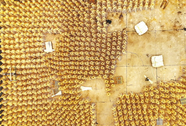 | ▶ 10月8日,奉新县柳溪乡荣森竹业有限公司,村民抢抓晴好天气,晾晒加工后的竹丝。近年来,奉新县依托当地丰富的竹林资源,积极引导村民将原竹加工成竹工艺品、建筑用竹板、生活用竹器等,提高竹子附加值,促农增收。
