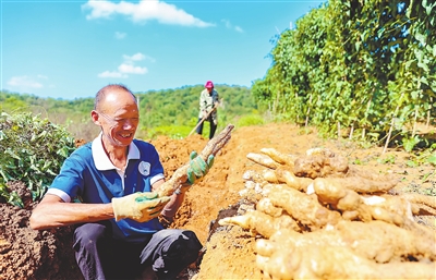 | ▲ 10月6日,瑞昌市南阳乡上坂村罗城山村民正在采挖山药。近年来,瑞昌山药俏销市场,已经成为当地村民增收致富的“金疙瘩”。特约通讯员 魏东升摄 |