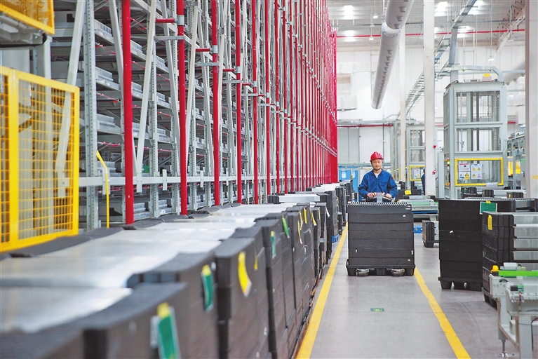 10月12日,在抚州高新技术产业开发区的抚州弗迪电池有限公司生产车间内,员工正在检测、运送用于新能源汽车的“刀片电池”电芯。该企业立足新能源产业,具备100%自主研发、设计和生产电池的能力,产品覆盖消费类3C电池、动力电池及储能电池等,项目达产后年产值约100亿元,实现就业人数约9000人。本报全媒体记者 吴福清摄