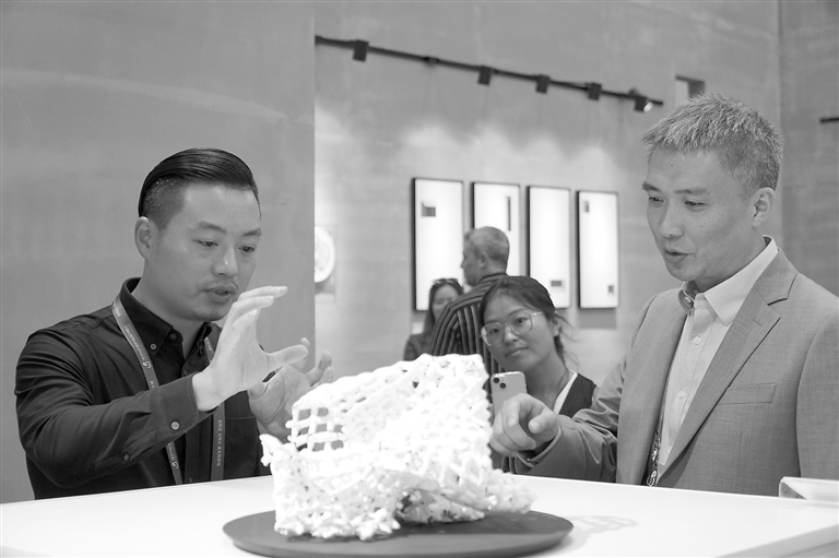 10月18日,2023中国景德镇国际陶瓷博览会上,参展商正向采购商介绍“洋景漂”陶瓷展品。据悉,本届瓷博会入驻交易中心的500多家商户今后将常态化运营。