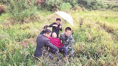 据悉,10月20日14时许,患有阿尔茨海默病的黄兰秀离家,不知去向,且未携带任何通信工具。获此情况后,头陂村委会立即组织村干部与民警开展寻找走失老人的行动。直至第二天凌晨1时,仍未找到老人。头陂镇党委又联系平安志愿者协会和广昌蓝天救援队协助开展寻找工作。10月21日8时许,头陂村村民曾小明看见有人躺在稻田,想起村里发布的寻人启事,急忙上前查看,“没错,就是黄兰秀。”曾小明马上通知村干部,在众人的帮助下,黄兰秀被护送回家。