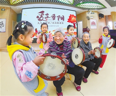 ▲10月20日,南昌市出新幼儿园的孩子们与老人们开展剪纸、铃鼓表演等传统民俗活动,敬老爱幼,其乐融融。本报全媒体记者 张翰林摄