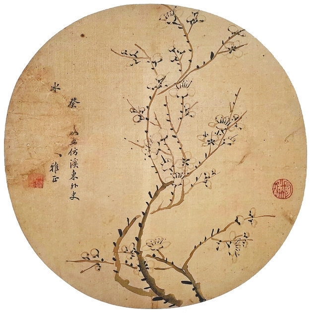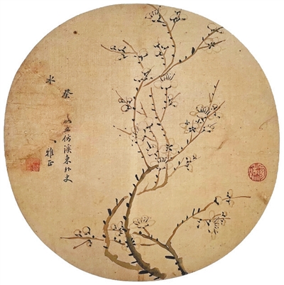 徐兆丰(1836-1908),字乃秋,江苏江都(今扬州)人,清代文士、学者、书画家,以擅长画梅花著称。笔者这件团扇正是以墨梅为题材,自下往上,寥寥数笔,勾出数枝错落有致的梅花,非常轻松随性,是典型的文人画法。以徐兆丰当年的名声和地位,这种精巧雅致的团扇或折扇应该是大受人们欢迎的“伴手礼”。可惜这把扇子的主人,不知后来是时运不济还是其他原因,竟然把家藏之物拿出来典卖。或许是为了保住自己的颜面,卖出之前把上款人的名字挖掉。