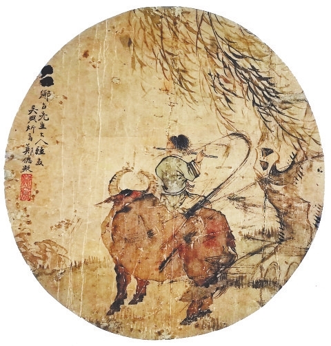 古代团扇的扇面一般是由绢丝织成,挖补起来难度较大。也有人为图省事,干脆粗鲁地用墨把上款人名字一涂了事。笔者正好也有一件这样的扇面,画的是一幅《牧归图》(下图)。作者先用没骨法画了一头壮硕的水牛,又用爽利的细笔线条刻画了一个牧童坐在牛背上吹笛。画中人物背向观者,点画精细,形神兼备。落款的开头被人涂成两块黑墨团,后面的文字为“□□乡台先生大人雅教,吴兴炘斋郑德凝”,钤“炘斋”印。作者郑德凝是清末海派画家,《寒松阁谈艺琐录》记载他“工画花鸟、山水、仕女,无不精妙。后专指头画,以柳条署款,不用毛笔。”现在有关郑德凝的生平资料不多,最常提到的是他有一名著名的女弟子——江西庐陵的周炼霞。