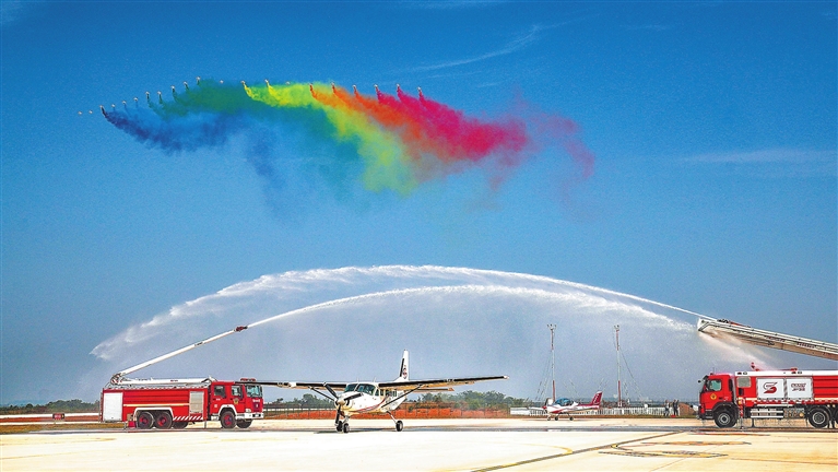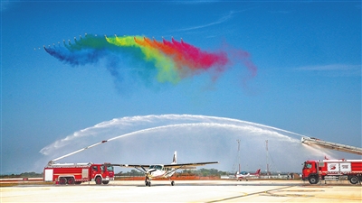 10月24日,在共青城南湖机场,即将起飞的飞机举行过水门仪式,标志着共青城南湖机场正式开航。