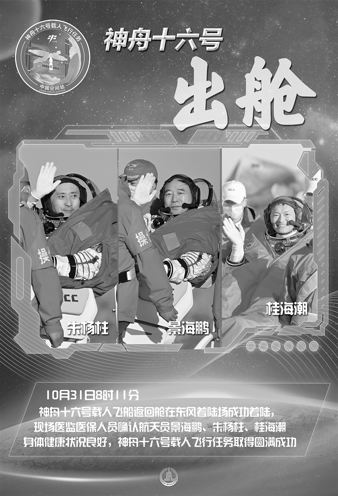 10月31日8时11分,神舟十六号载人飞船返回舱在东风着陆场成功着陆,现场医监医保人员确认航天员景海鹏、朱杨柱、桂海潮身体健康状况良好,神舟十六号载人飞行任务取得圆满成功。据中国载人航天工程办公室消息,圆满完成神舟十六号载人飞行任务的航天员乘组,于10月31日乘坐任务飞机平安抵达北京。