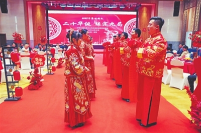 本报讯(全媒体记者徐黎明)10月30日上午,一场集体婚礼让位于奉新县的某项目工地增添了喜气。5对新人身穿中式礼服步入会场,先后进行了初见之礼、跨火盆、过马鞍、宣读婚书、夫妻对拜等仪式。此次5对新人中有6人是中铁九局大连分公司海内外的建设者,他们参加过刚果(金)建设工程项目、成昆铁路工程、玉楚高速公路工程、福州工业北路市政工程、泉州纺织学院工程和奉新选矿厂等重点工程的建设,这场集体婚礼也收到了来自海内外职工的祝福。