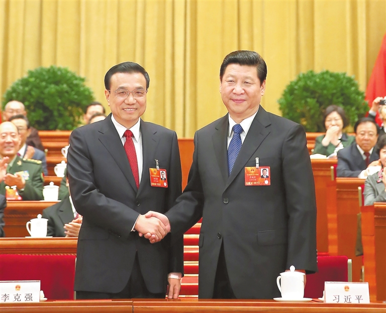 2013年3月15日,第十二届全国人民代表大会第一次会议在北京人民大会堂举行第五次全体会议。会议经过投票表决,决定李克强为中华人民共和国国务院总理。这是习近平同志和李克强同志亲切握手。 新华社记者 兰红光摄