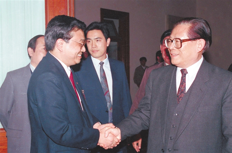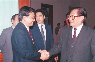 1993年5月3日下午,中国共产主义青年团第十三次全国代表大会在北京人民大会堂开幕。在5月3日上午的预备会议后,举行第一次主席团会议,推选李克强等同志为主席团常务主席。这是江泽民同志与李克强同志握手。 新华社记者 郭占英摄