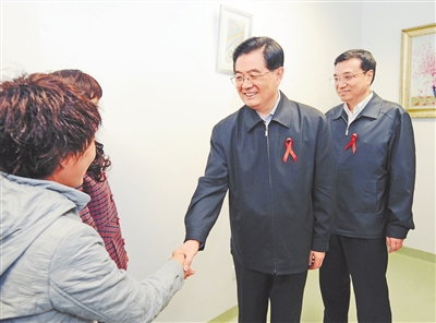 2008年12月1日是第21个世界艾滋病日。胡锦涛同志和李克强同志来到北京地坛医院考察艾滋病防治工作。新华社记者 马占成摄
