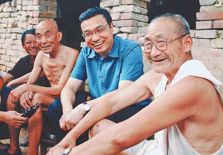2003年8月8日,李克强同志在河南省新乡市调研。这是李克强同志在原阳县桥北乡马庄村与村民亲切交谈。新华社发 (郭 宇摄)
