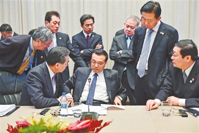 2014年12月16日,李克强同志在贝尔格莱德出席第三次中国-中东欧国家领导人会晤。这是会谈间隙,他与随行部长进行会商。 新华社发