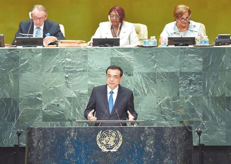 2016年9月21日,李克强同志在纽约联合国总部出席第71届联合国大会以“可持续发展目标:共同努力改造我们的世界”为主题的一般性辩论并发表题为《携手建设和平稳定可持续发展的世界》的讲话。 新华社记者 李 涛摄