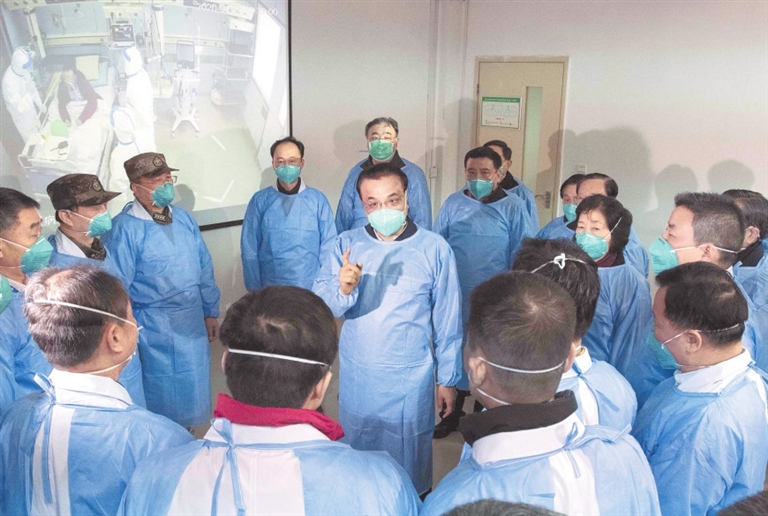 ◀2020年1月27日,李克强同志赴湖北省武汉市考察指导疫情防控工作,代表党中央、国务院慰问疫情防控一线的医务人员。 新华社记者 李 涛摄