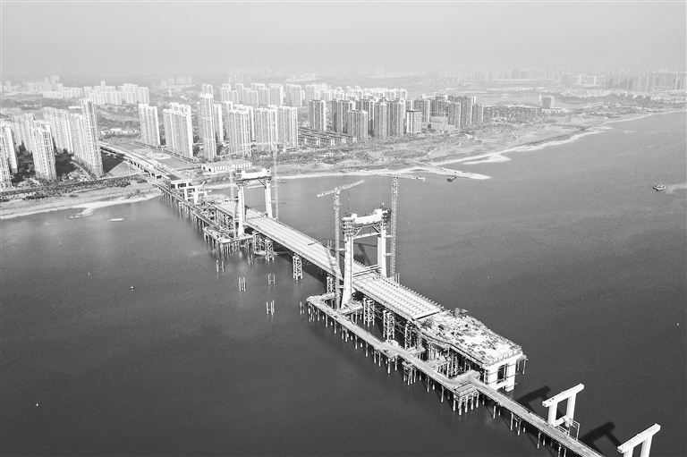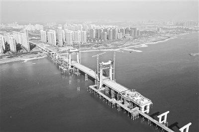 11月1日,南昌洪州大桥工程建设现场一片繁忙景象。目前,该大桥桩基全部施工完成,全面进入主桥缆索施工阶段。洪州大桥工程西至红谷滩区三百山路,东至东祥路口东侧,全长约4.34公里,双向8车道,预计明年9月底建成通车。 本报全媒体记者 洪子波摄