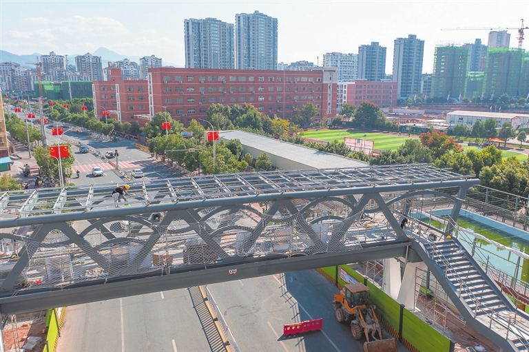 目前,工人正在加紧对城关第四小学附近的人行天桥进行收尾工作。“为让人行天桥早日投入使用,我们多次优化调整施工方案,白天进行工程施工,同时避开车辆通行高峰时段,晚上进行桥梁吊装,在确保质量前提下,加快施工进度,不到两个月就完成项目建设。”项目建设负责人张贤有介绍。