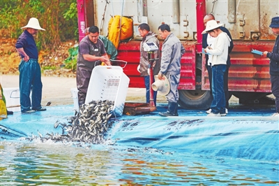11月8日,记者来到仙女湖一处码头,只见一辆装载鱼苗的货车停靠在岸边,工作人员正忙着卸苗、称重,将一尾尾鱼苗投放湖中。“我们每年一般投放100多万斤鱼苗,主要是鳙鱼和鲢鱼,这种人工增殖放流的方式有利于湖体生态。这种有机鱼从催产、成苗、育苗、放养等过程全部属于生态养殖,鱼儿吸食水中的浮游植物,还能防止湖面产生蓝藻。”江西仙女湖渔业有限公司副总经理万金平介绍。