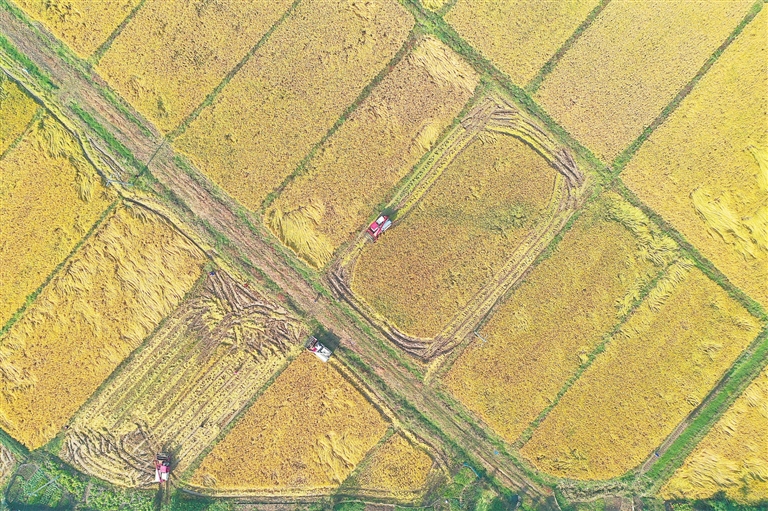 11月15日,上高县南港镇前进村,村民正在收割晚稻。连日来,该县各地农户开镰收割晚稻,确保颗粒归仓。特约通讯员 陈旗海摄