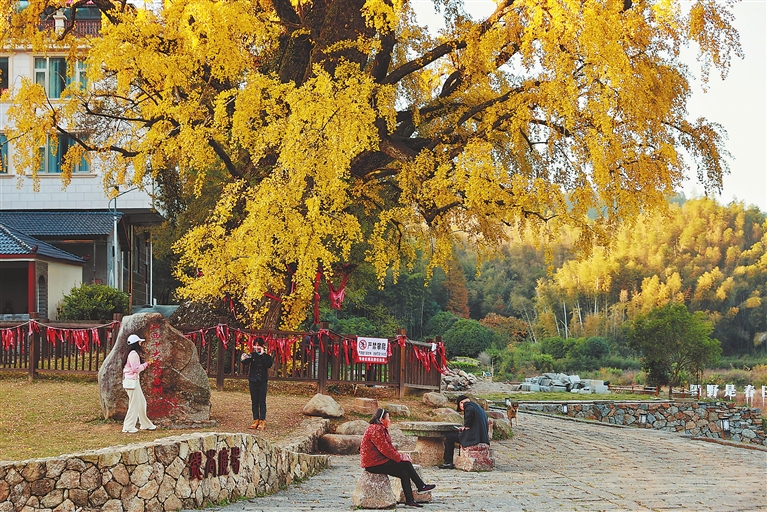 11月20日,在南昌湾里管理局太平镇太平村,千年银杏树披上了“金装”,迎来最佳观赏期,吸引了不少游客前来打卡拍照。本报全媒体记者 洪子波摄