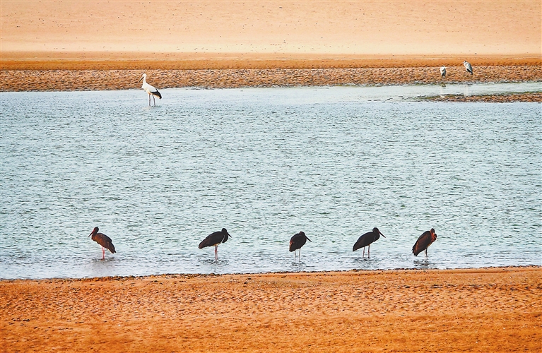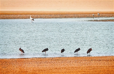 11月18日,鄱阳湖畔永修县三角乡水域,几只黑鹳漫步在浅水滩涂上,与东方白鹳同框,一起觅食。“鸟中大熊猫”黑鹳和“鸟中君子”东方白鹳均为国家一级保护动物,“国宝”鸟类同框,更属罕见。本报全媒体记者 徐 铮摄