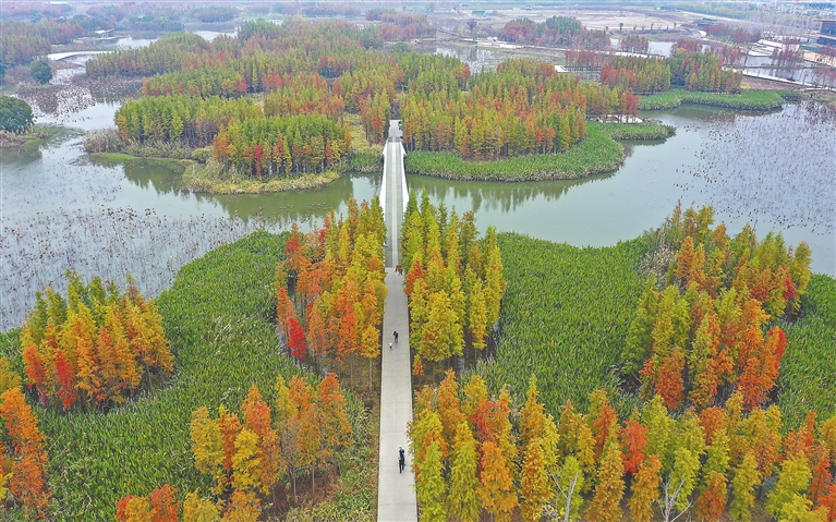 11月26日,南昌高新区鱼尾洲湿地公园,水杉、池杉、落羽杉等树木色彩斑斓,美不胜收,吸引市民前来赏景游玩。