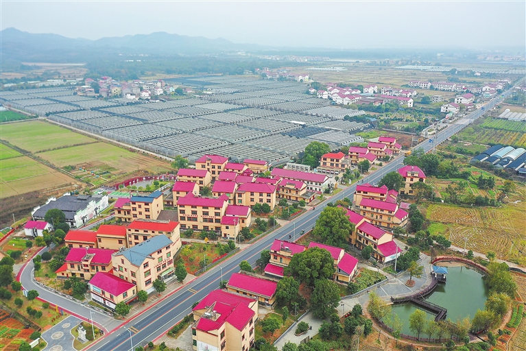 11月30日,无人机航拍下的贵溪市雷溪镇,一排排蔬菜大棚整齐连片,一幢幢楼房错落有致。贵溪市深入贯彻落实习近平总书记考察江西重要讲话精神,加快农业产业化步伐,推动农村一二三产业融合发展,全面推进乡村振兴。近年来,该镇通过实施高标准农田建设,加快土地流转,加大招商引资力度,引进现代农业公司,带动当地农民致富。