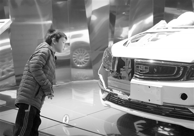 12月9日,一个小朋友在北京汽车博物馆了解新能源车构造。
