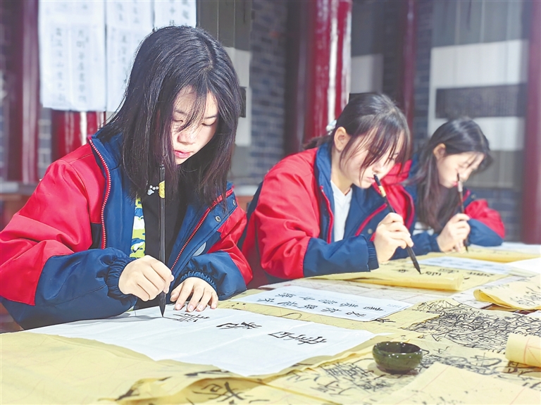近日,都昌县慈济中学的师生把课堂“搬”进了衙前古村。在古色古香的“学堂”中,学生们跟随老师,认真学习楷书书写要点,传承书法艺术,弘扬中华文化。本报全媒体记者 周亚婧摄