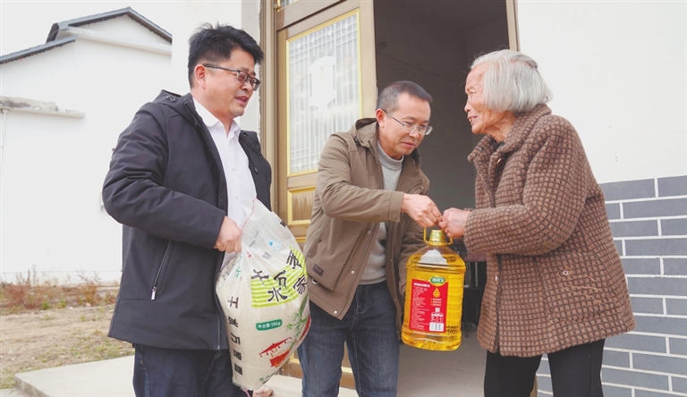 12月10日,修水县杭口镇人大工作人员为双井村杨烈英老人送去大米、食用油。寒冬来临,该镇开展走访慰问活动,为困难群众送去关爱,确保他们温暖过冬。本报全媒体记者 梁振堂摄