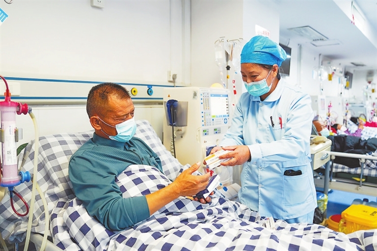 与喻某中一样,年过五旬的龚某已有10年血液透析史。“之前挂号、缴费、取药都是自己跑来跑去,对像我们这样的病患来说的确是比较大的负担。”说起之前来血液透析的情形,躺在病床上的龚某不禁感慨道。现如今,到院后由医护人员收集医保卡,统一为他们办理挂号、缴费、取药等事项,既省去了病人或家属跑上跑下办手续的麻烦,又大大缩短了病人等待上机的时间,简化了就医流程。