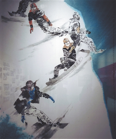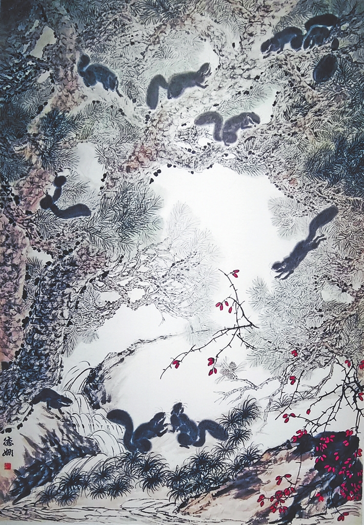 作品大多为大尺幅,体现与全国美展接轨,也适合在大型展厅展示,这在形式上富有时代的烙印。高2米、宽1.44米的张德娜国画《子游图》(左下图),运用传统的笔墨技法,描绘了一幅松鼠嬉戏松树间生动可爱的画面。中间大面积留空,与繁密的松树形成疏密对比;灵动的松鼠与粗壮的松树干形成动静对比。孔维克的国画《雪野大川进行曲》(左上图),高2.4米,宽2米,在大展厅里气势夺人。画面上数名滑雪队员急速而下、动感十足,“S”形构图使画面显得十分和谐唯美。