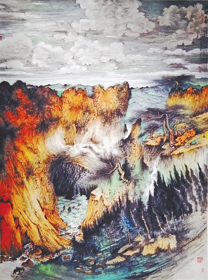 山水画如何在立足传统的基础上创新,山水画家们无不为之孜孜以求、不懈探索。常朝晖的墨彩国画《故乡的云》(右上图),画面主体的山体大面积呈黄红色,有水彩粉画和油画的效果,与中国画传统的树、石、云形成鲜明对比,耐人寻味。