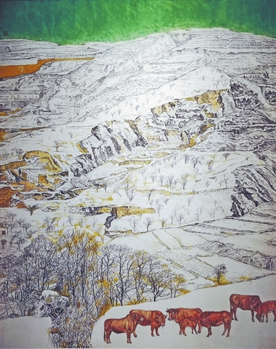 创新,是中国画发展永恒的主题。刘扬的《黄河岸边》(右中图),属于山水画范畴,而底部的牛群也很醒目。山水、花鸟、人物等画种之间的界限逐渐打破,这也是现代绘画发展的一种新趋势。7头牛姿态各异,筋骨嶙峋,自然使人想到十大传世名画之一——唐代韩滉的《五牛图卷》。传统的牛与现代的山川草树融为一体,加上画上方绿色的天空,使整个画面富有现代装饰意味。