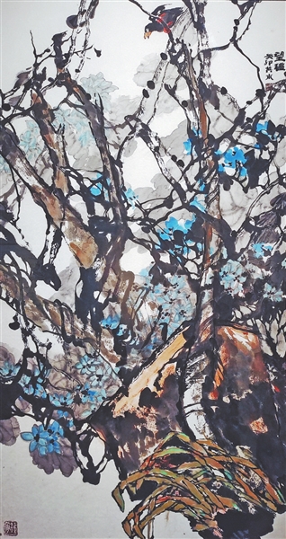赵英水的花鸟国画《望秋》(右下图),以草书笔法入画,线条苍茫老辣,格调不俗。刚猛的树枝、藤条和石头,在背景和树枝中间用淡墨色、淡蓝色菊花破之,使画面显得尤为协调和富有生气。