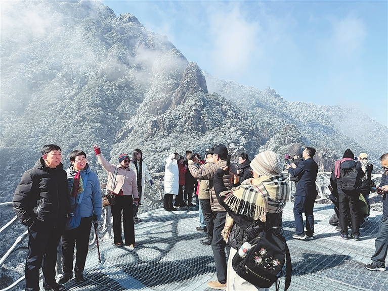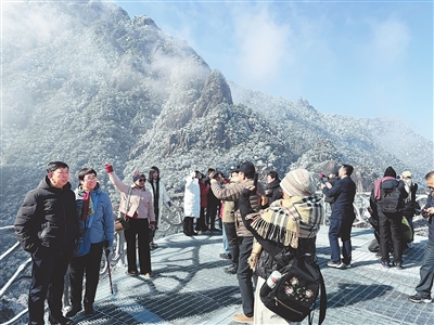 12月20日,游客正在上饶三清山景区赏雪游玩。受近期低温冷空气影响,三清山景区迎来今年入冬第一场雪,景区银装素裹,宛若银色童话世界,吸引众多省内外游客前来参观游览。通讯员 王元星摄