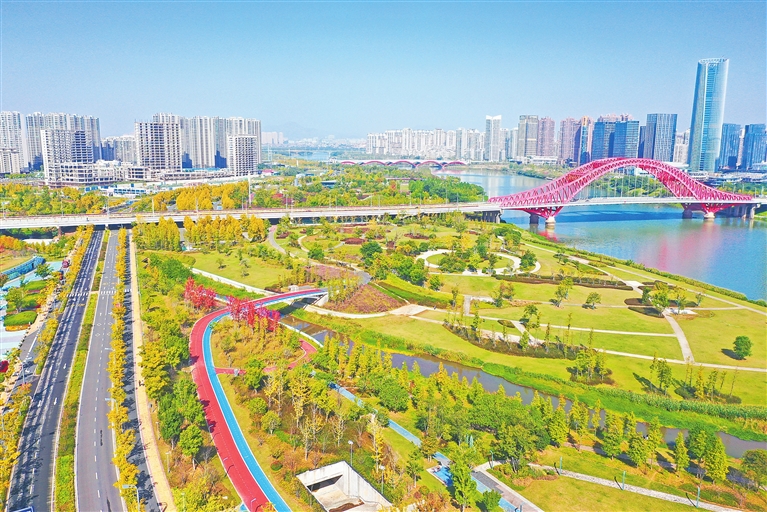 日前,赣州蓉江新区滨江公园在蓝天的映衬下,与周边社区构成一幅绿色生态的城市画卷。近年来,蓉江新区精心建设新世纪(运动)公园、十里花溪公园等项目,累计建成公园绿地4100余亩,栽种绿化乔木6.17万株,成为赣州中心城区的“绿肺”。尹 铮摄