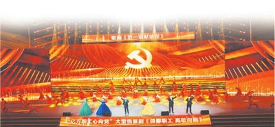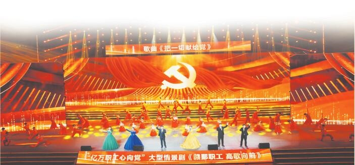 7月1日晚,大型情景剧“亿万职工心向党”——《赣鄱职工 高歌向前》在南昌精彩上演,这是由江西省总工会精心推出的原创大剧,来自各行各业的劳模工匠、产业工人、新业态劳动者、教师、医务人员等职工代表共1500余人共享视听盛宴。情景剧围绕百年党史、工运史,集中展现了在中国共产党的领导下,赣鄱职工不畏艰险、高歌向前的精神面貌。