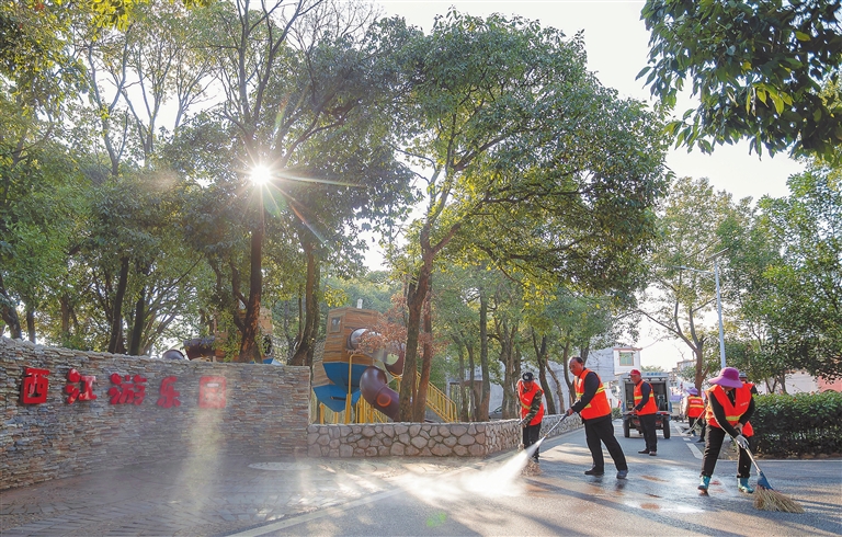 12月27日,在贵溪市志光镇西江村,物业工作人员正清扫巷道路面。当地全面施行“物业进乡村”,通过引进专业的物业公司,给辖区村庄提供保洁、绿化、管护等服务,有效改善人居环境,村民幸福指数得到提升。