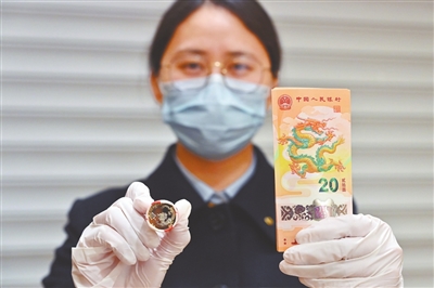 1月9日,中国建设银行北京兴融支行的工作人员展示2024年贺岁双色铜合金纪念币和纪念钞。