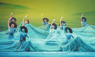 在《大湖之灵》中,有许多震撼人心的劳动场面,开场即是渔女编织渔网、渔民捕捞的壮丽场景,舞台背景是波光粼粼的大湖,演员们的舞蹈动作丰富、细腻、精妙,表达了当地渔民捕鱼作业时欢快的心理。舞蹈作为“有意味的形式”,形神兼备的舞蹈技巧与劳动行为结合,展现了民族性、地域性的独特风貌,给观众提供了共同体审美的意义空间。