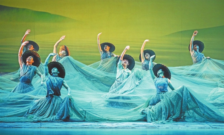 当代题材的“当代性”表达,历来是舞剧创编的难题。《大湖之灵》的题材取自江西本土,长江文化土壤孕育了该剧。总导演花鸣表示:“这是一部以鄱阳湖生态为话题的当代现实主义舞台创作,呼吁生态的背后实则探讨的是‘命运’。”本剧主人公芦荻在“十年禁渔”后回到故乡,儿时的记忆历历在目,过往的“爱与痛”似乎变得更加清晰,大美鄱阳湖的盛景也成为当初选择的历史验证,无不展现了守望绿色、守望生态的主题。