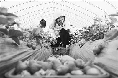 1月8日,奉新县冯川镇赤埆村草莓采摘园,游客在采摘草莓。近年来,该县引导农户利用温室大棚种植优质瓜果、蔬菜等,拓宽增收渠道。谢文凡摄