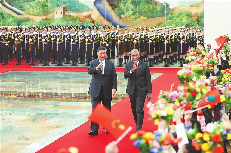 会谈前,习近平和夫人彭丽媛在人民大会堂北大厅为穆伊兹和夫人萨吉达举行欢迎仪式。