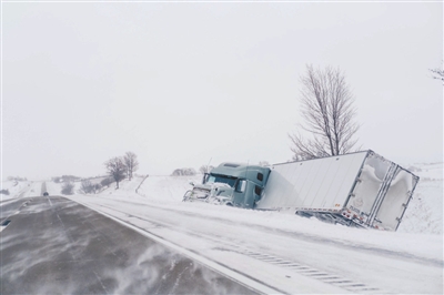 1月13日,在美国艾奥瓦州,一辆卡车因车祸停在路边。