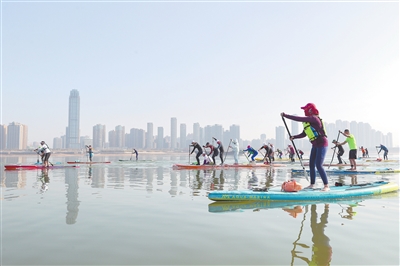 1月13日,暖阳高照,赣江南昌朝阳大桥段热闹非凡,一群水上运动爱好者划着桨板在江面自由穿行,享受运动带来的乐趣,成为赣江上一道亮丽的风景线。
