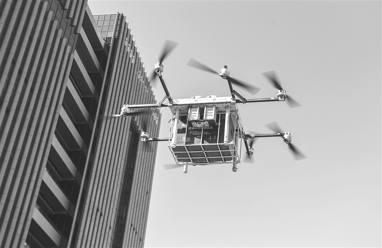 1月19日,在深圳市血液中心,无人机启程前往中山大学附属第八医院。